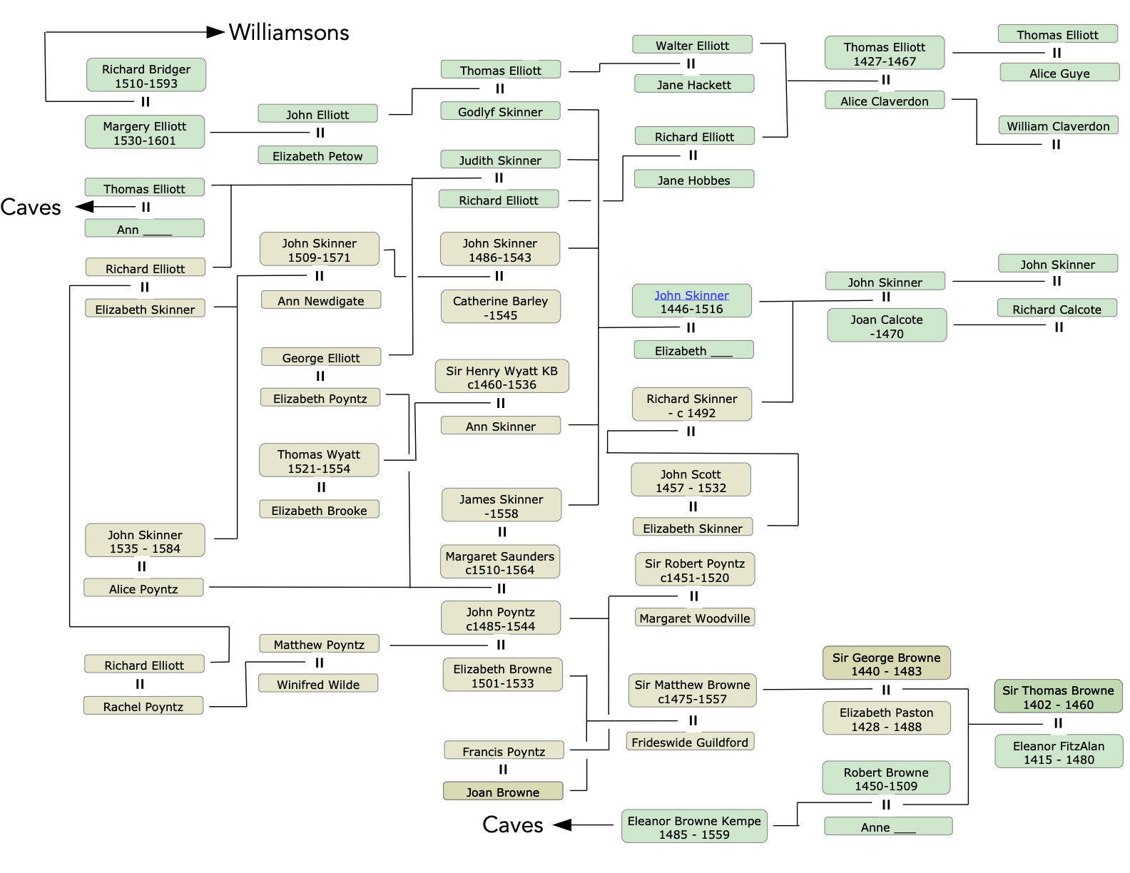 The Elliotts were merchants, first in the wool trade in Surrey and later in various businesses in London (Thomas, husband of Ann, was a London draper), and mostly stuck to commerce. However, the families with which they intermarried, particularly the Skinners and their kin, played a significant role in Surrey politics in Tudor times. The Skinners had been involved in Surrey government for several hundred years (see John Skinner for some details) several also held positions at court, and they became allied with one of the groups contending for dominance in Surrey.