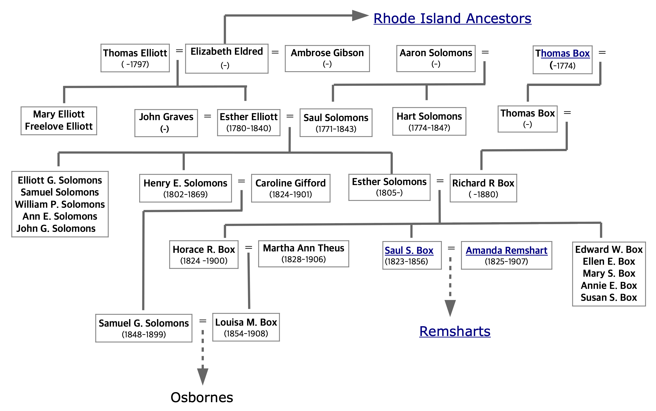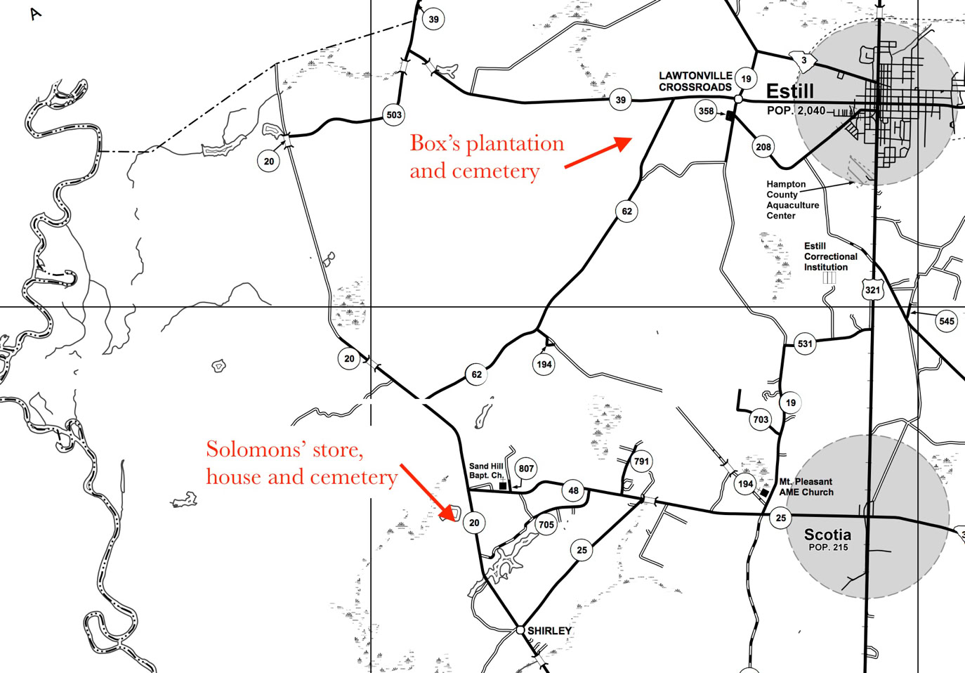 As is typical in small communities, everyone soon began marrying their neighbors. Freelove, the daughter of Thomas and Elizabeth Elliott, married another Thomas Elliott from the same area and, after his death, married William Patterson, Thomas Patterson's nephew. Esther, another daughter of Thomas and Elizabeth, first married John Graves, a neighbor; after his death she married Saul Solomons. At some point in the early 1800's, Saul and Hart Solomons, with their families, and Thomas Box and his family moved together about 30 miles west into Hampton County (St. Peter's Parish) to land near the Savannah River that had been vacated by the large migration of South Carolineans to Louisiana after the Louisiana Purchase. There they (and Pattersons) continued to intermarry, and there Saul and Hart established a store, and also became cotton factors, taking local cotton to Savannah for sale. And there most of the families remained for many years, owning land spread between Estill SC and the Savannah River. (for more details, see The Solomons of Beaufort District, by Carolyn Ramsay)