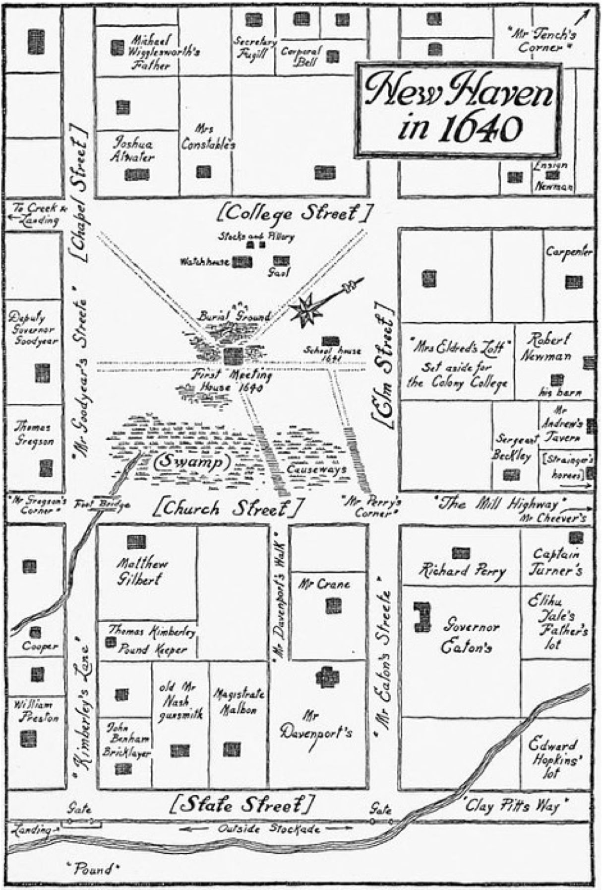 Jasper was the son of Richard Crane and Margaret Gouldstone of Welwyn, Herts. He moved to London, where he was a parishioner of St. Stephen’s Church, Coleman St, whose minister was the fanatically rigid Puritan, John Davenport. When Davenport fled to the Netherlands, Crane accompanied him, and he was a member of the group which travelled with Davenport to Massachusetts on the Hector, in the summer of 1637. From there, the group moved south, to found the colony of New Haven, and he was one of the 60 signers of the Fundamental Agreement of the New Haven Colony, signed on June 4, 1639. Although not wealthy (in the top quartile in wealth but no higher) he was clearly one of the leaders of the new colony, serving repeatedly as magistrate and member of the General Court. He was a surveyor, and with another laid out the original lots of the town. His own house was located on Elm Street, in a prime location next door to Davenport’s, and across the street from Governor Eaton’s.