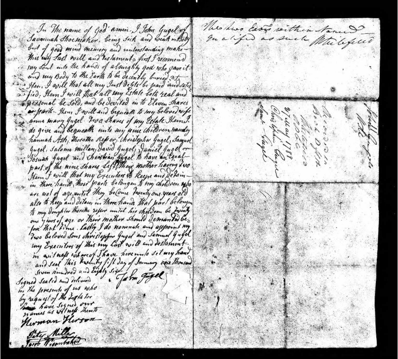 Johann- a shoemaker- and his brother Matthias arrived in Savannah on the Charles Town Galley in 1749, as part of the Fifth Palatinate Transport. Both were indentured servants, but soon bought their freedom. They first settled in Ebenezer, but at some point, Johann and Anna Maria moved to Savannah, where his will was recorded in 1780.