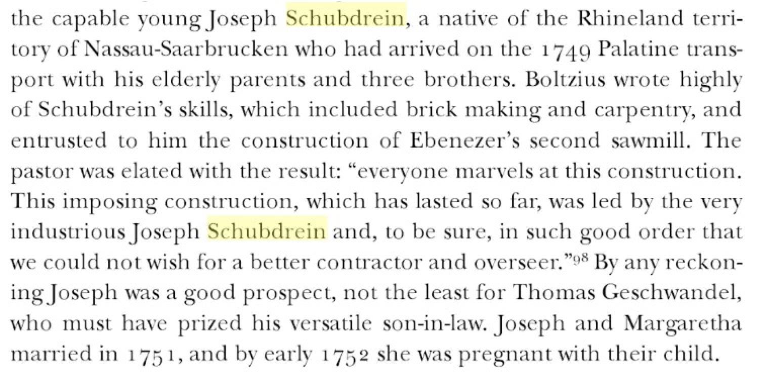 Joseph, his father and his three brothers came to Georgia on the Charles Town Galley in 1749 as part of a group of about 70 Germans. Most of the group, including the Schubdreins, could not pay their own way and came as indentured servants. Joseph and one brother, both carpenters, were servants of the minister Bartholomew Zouberbuhler, but the Ebenezer pastor, John Bolzius, bought their freedom for £6 each shortly after they arrived.